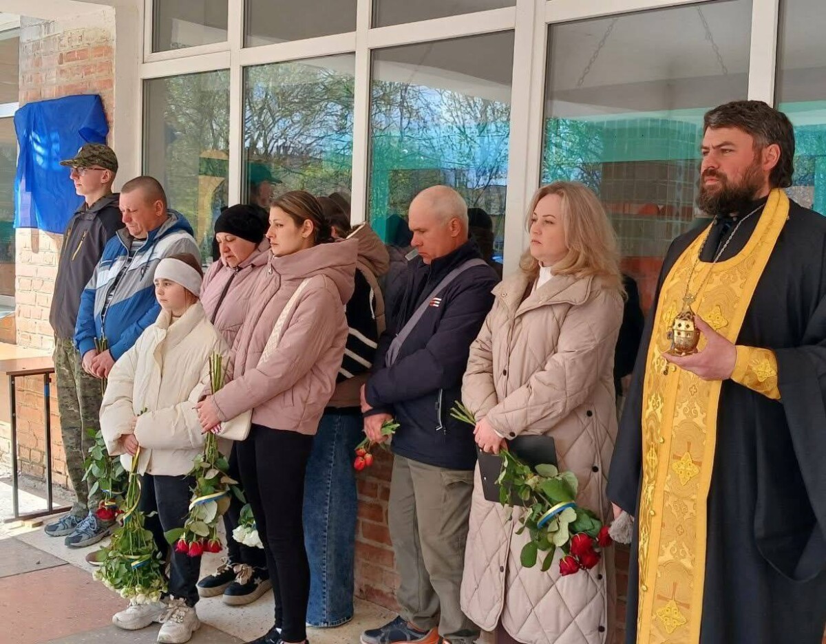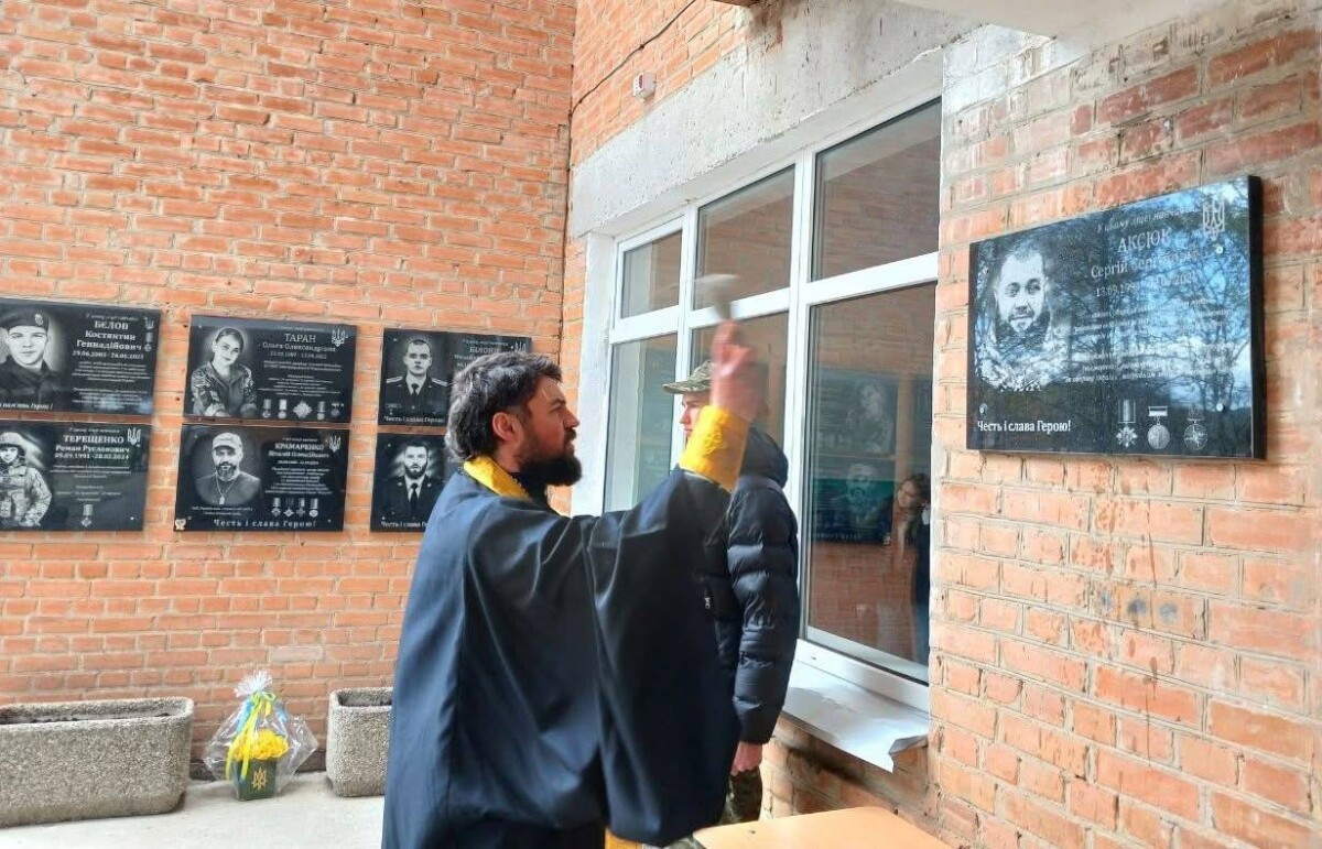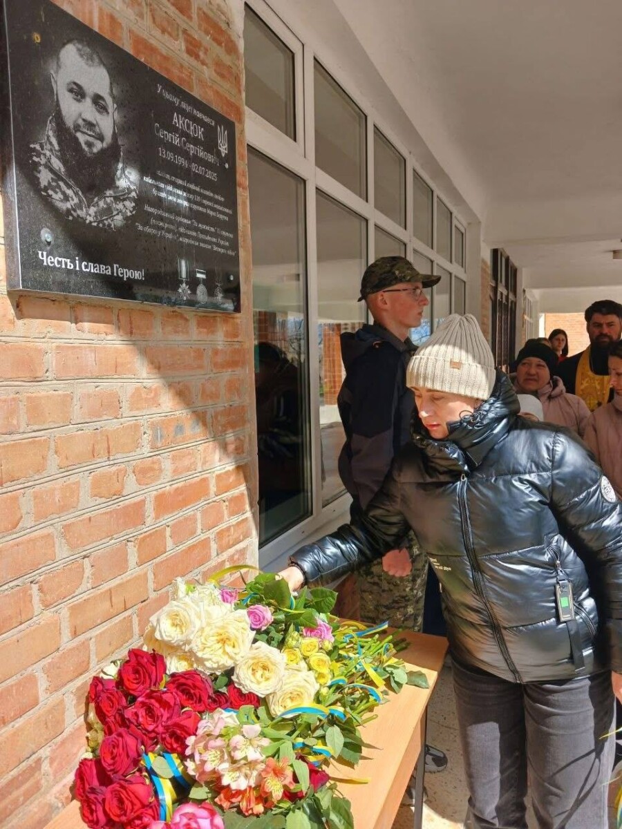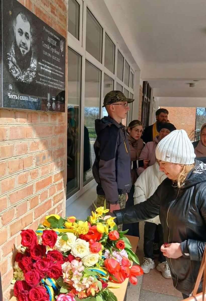 Поруч із меморіальними дошками іншим полеглим землякам тут відкрили пам’ятний знак на честь випускника закладу — Сергія Сергійовича Аксюка.